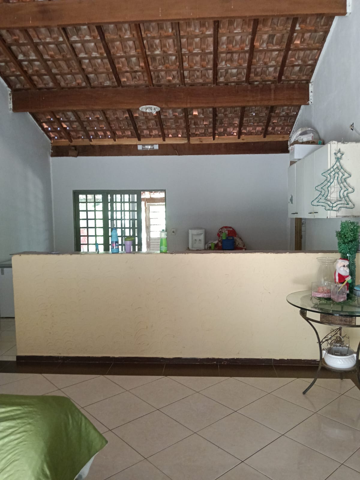 Sala dupla com madeira aparente.